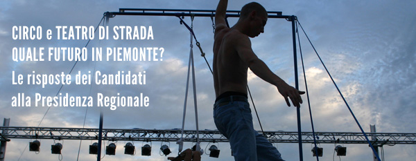 Il 5 maggio Paolo Stratta, fondatore di Cirko Vertigo ed esperto di teatro di strada e circo contemporaneo, ha sottoposto ai sei candidati alla Presidenza della Regione Piemonte due importanti quesiti. In particolare è stato chiesto loro di esprimersi su quale spazio attribuiscano alle arti circensi ed al teatro di strada nel più ampio settore della cultura piemontese e se ritengono possibile ampliare la dotazione economica della Legge regionale 15 luglio 2003 n. 17 "Valorizzazione delle espressioni artistiche in strada", che sostiene oggi con un budget complessivo di 200.000 euro le espressioni artistiche in strada. Riportiamo in ordine di arrivo le riposte pervenute inviandole ai 12.000 destinatari della nostra newsletter per darne la più ampia diffusione possibile.